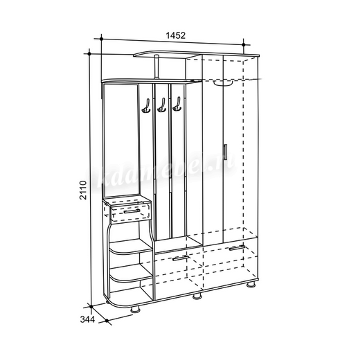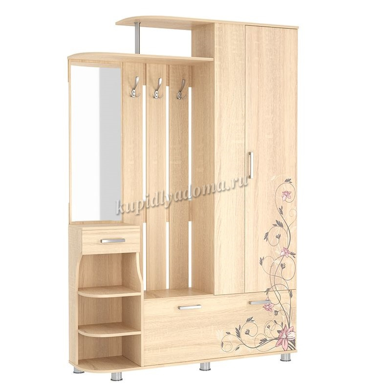 Состоит из: шкафа с выдвижной штангой, вешалки с крючками для одежды и сумок, обувницы, открытых полок, зеркала, полки для головных уборов, выдвижного ящика. Сборка универсальная.