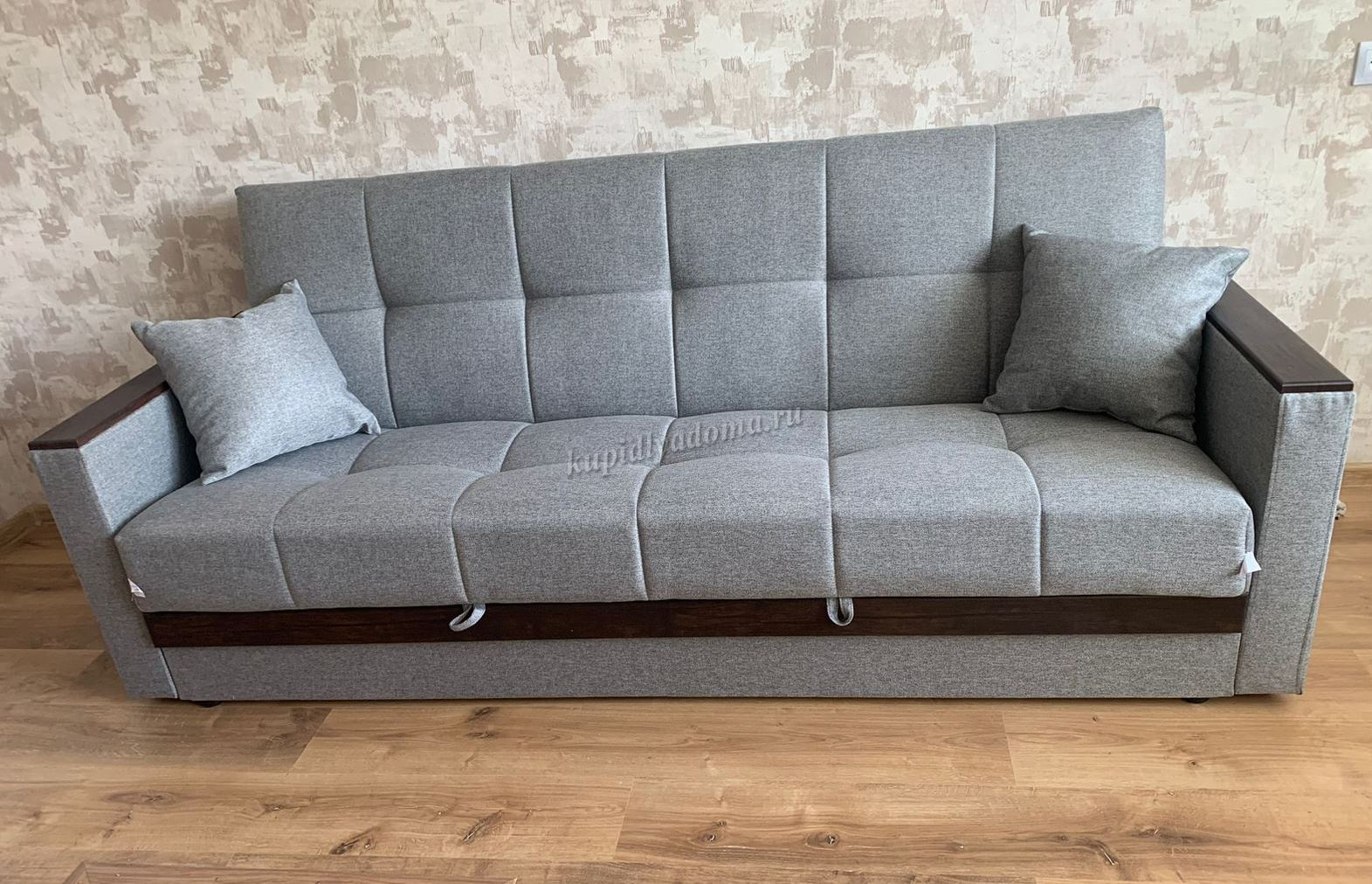 При трансформации требуется расстояние между диваном и стеной. Мебель является пристенной. Механизм «Книжка» прост и надежен в эксплуатации. Напольное покрытие в процессе раскладки не задействовано, Вы можете использовать пушистые ковры или дорогие паркеты. Емкость для хранения постельных принадлежностей с ламинированным основанием обеспечит Вам дополнительное пространство для хранения и сэкономит Ваше время при подготовке дивана ко сну. Ламинированное основание обеспечит простоту и удобство при уборке. Декоративные накладки из МДФ на подлокотниках и передней части короба, сочетают в себе представительность и элегантность, придают изящность дизайну